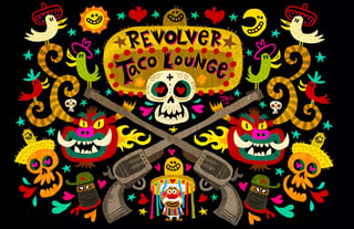 Premium hooded sweatshirt with front pocket featuring the colorful Revolver Taco Lounge Logo on the front