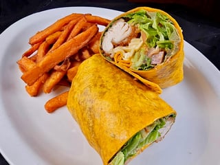 cheese, drizzled with smoked paprika aoili and wrapped in a jalapeño cheddar flour tortilla. Served with a side of sweet potato fries.
