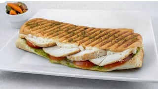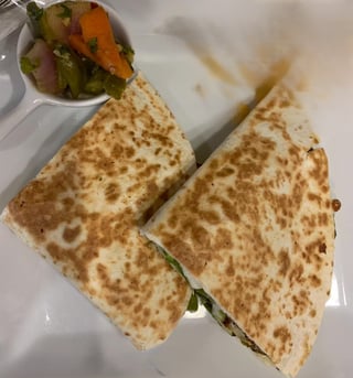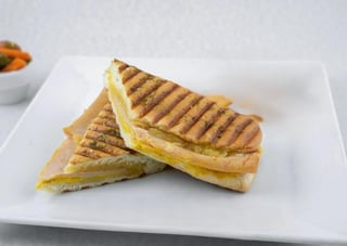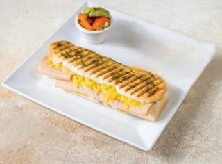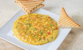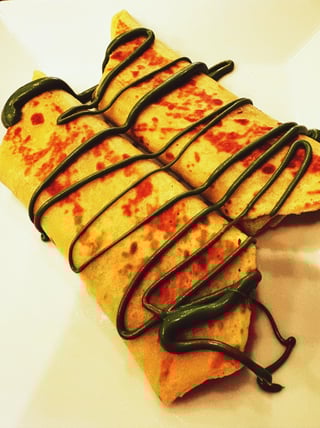 The perfect fiesta in a roll. Omelette stuffed with grilled chicken breast, bell peppers, roasted onions & mozzarella cheese, served with sour cream on the side.