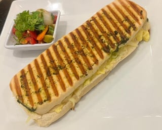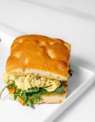 Fluffy omelet eggs, cheddar, fresh arugula, creamy cheese, and savory olives — all tucked into soft, toasted focaccia bread.