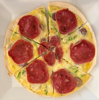 Eggs, olives, green pepper layered on crispy tortilla bread and topped with mozzarella & salami
