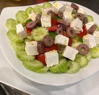 Green bell peppers, lettuce, cucumbers, tomatoes, black olives, thyme, feta cheese, drizzled with olive oil and served with Auntie Loulou's homemade vinaigrette