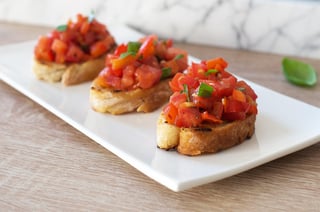 Baguette slices topped with diced tomatoes, pesto and drizzled with olive oil