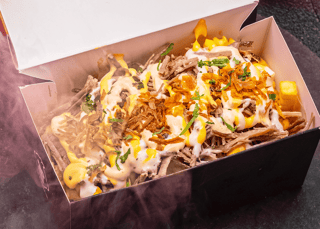 بطاطس كرنكل المقرمشة محشوة بنوعين مختلفين من الصلصات الخاصة ، الهالبينو ، والبريسكت المطهو على مدار 24 ساعة.