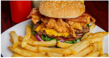 Fried Chicken, bacon, single patty beef burger, lettuce, tomato, onion, ketchup, mayonnaise, mustard.