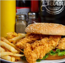 Two tender strips of chicken breast fried to golden perfection. Served with fries and a drink.