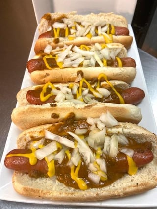 Chili, mustard, white onions