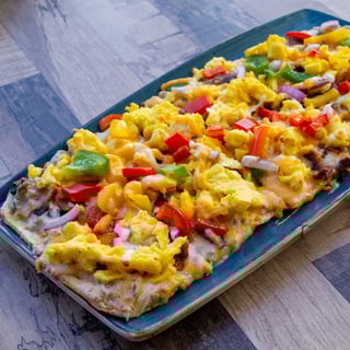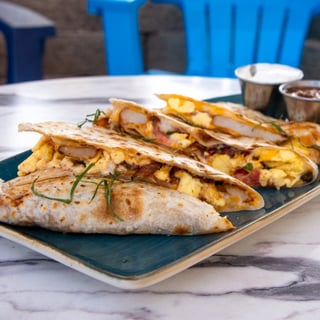 13" tortilla, Mexican cheese blend, scrambled eggs, pico de gallo, sour cream, roasted salsa, green onion