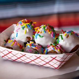 cake donut holes, birthday cake frosting, rainbow sprinkles