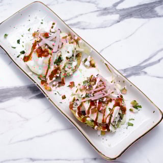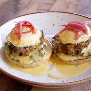 poached eggs, chorizo meatloaf, toasted english muffin, avocado mash, hollandaise, pickled onion, paprika