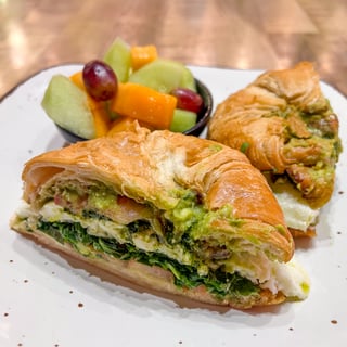egg whites, croissant, guacamole, arugula, tomato, queso fresco, basil pesto, served with fresh fruit
