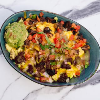 scrambled eggs, carne asada, black beans, brunch potatoes, Mexican cheese blend, green chile sauce, pico de gallo, guacamole