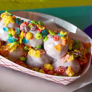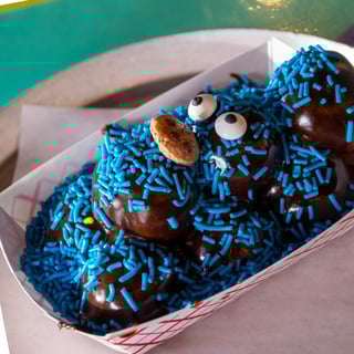 cake donut holes, chocolate frosting, blue sprinkles, cookie crisp, candy eyes