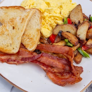 fluffy scrambled eggs, bacon, brunch potatoes, sourdough toast, butter, jam