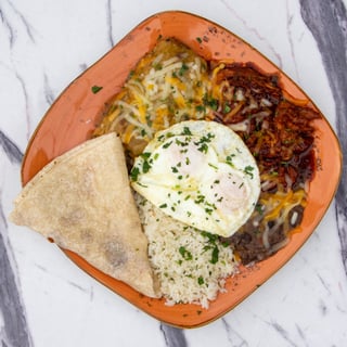 smothered in monterey jack cheese, topped with 2 fried eggs, a fresh warm tortilla