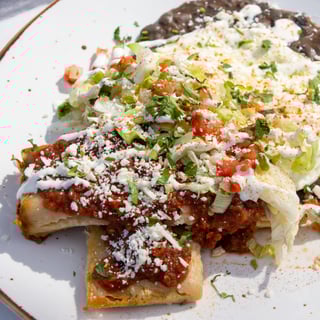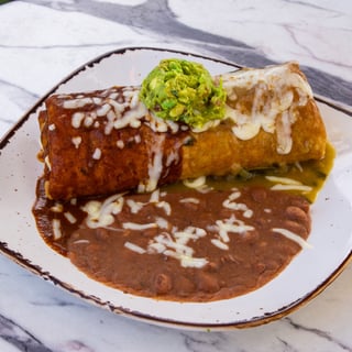 Choice of red, green, or Christmas-style chile sauce, with cotija & cilantro. Served with cilantro-lime rice & choice of beans.