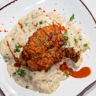 fried chicken breast, O.H.S.O. sausage gravy, two biscuits, salsa huichol, cilantro
