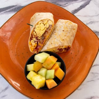 choice of bacon or chorizo, cheddar jack, egg, potato barrels, sour cream, roasted salsa, served with side of fruit