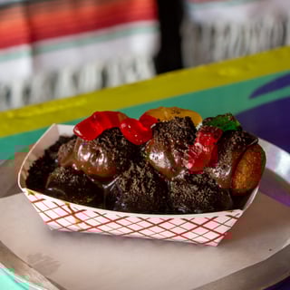 cake donut holes, chocolate frosting, crushed oreos, gummy worms