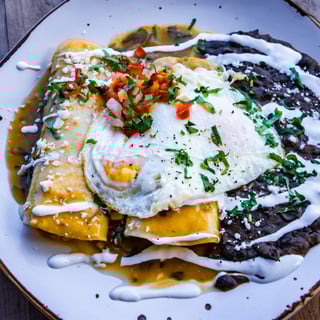 over-easy eggs, spicy green chile pork, corn tortillas, asadero cheese, green chile sauce, lime crema, pico de gallo, choice of beans