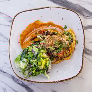 egg whites, charred broccolini, blistered cherry tomatoes, street corn, spinach, smoked paprika, cotija cheese, cilantro, smoked almond romesco, greens