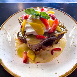 cinnamon swirl bread, tres leches cream, bourbon ginger glaze, whipped cream, mango, strawberry, mint