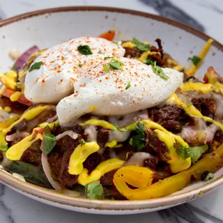 poached eggs, carne adovada, brunch potatoes, asadero cheese, aji amarillo aioli, bell peppers, red onion, cilantro, paprika