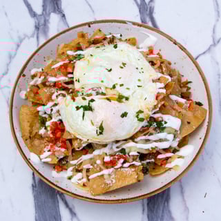two fried eggs, corn chips, red or green enchilada sauce, lime