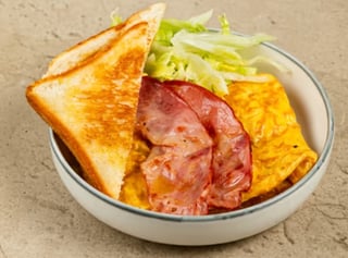 With omelet, bacon, cheddar, iceberg and mayonnaise