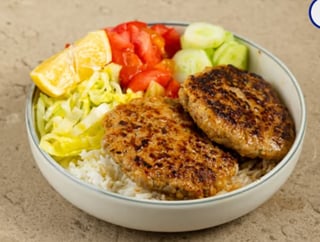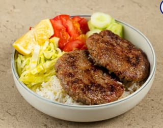 With beef burger - cucumber - tomato and iceberg. Accompanied by basmati rice 150 g