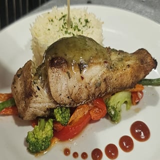 In House Minced & Seasoned Salmon fillet, tartar sauce, red onions, capers, lettuce & tomatoes