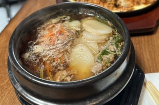 beef Ribeye soup with glass noodle, rice cake, jalapeno, white mushroom, onion and scallion