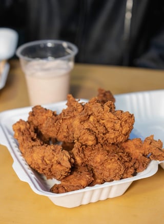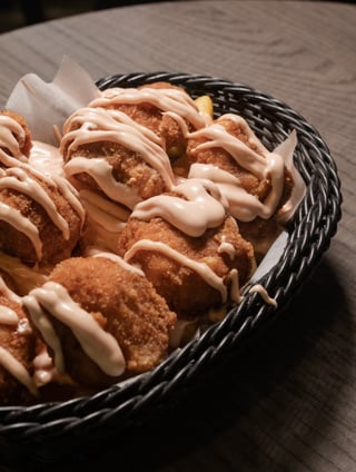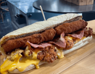 - Crispy chicken - mac n cheese sticks - bacon - cheddar sauce