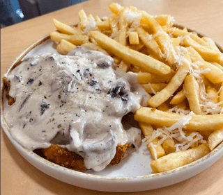 Τηγανητό κοτόπουλο,κρέμα γάλακτος,μανιτάρια,πατατες τηγανιτές