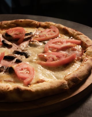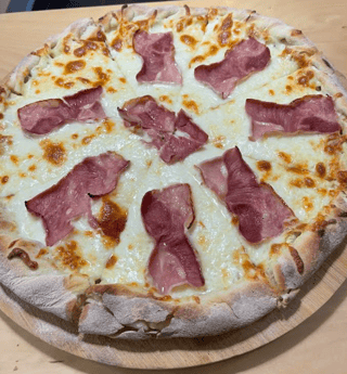 - Tomato sauce, mozzarella, edam, bacon, pepper, ham, mushrooms