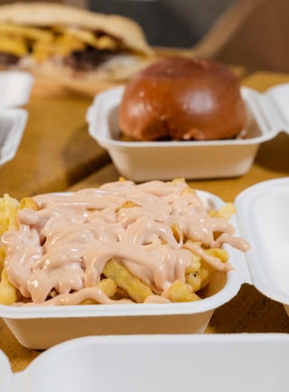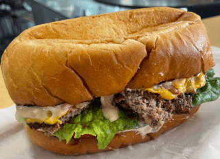 - Potato bun, spicy mayo, beef burger, caramelized onions, cheddar, tomatoes)