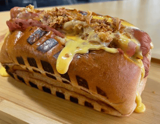 Διπλό λουκανικο - Bbq Sauce - Cheddar sauce - bacon - καραμελωμένο κρεμμύδι - τραγανό κρεμμύδι