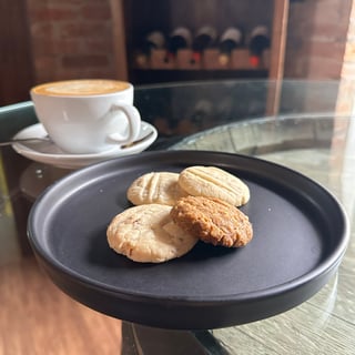 Café o te a escoger acompañado de 4 galletas: almendras, nueces, mantequilla y galleta de avena con naranja.