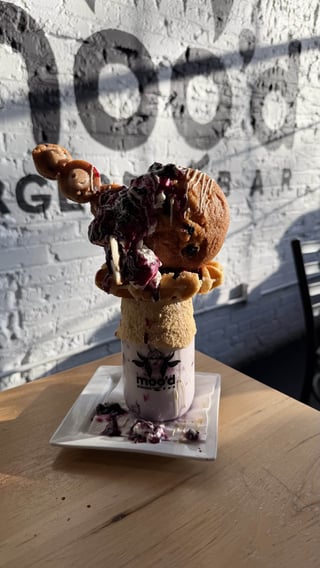 2 scoops of Salted Caramel Brownie Ice Cream + Chocolate Drizzle + Topped with Cosmic Brownie + Whipped Cream + Rainbow Crunch Sprinkles