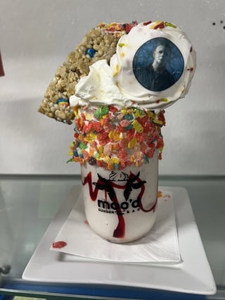 Vanilla Ice Cream + Fruity Pebbles + Red Drizzle + Fruity Pebbles Bar + Lucky Charms Bar + Horror Cupcake