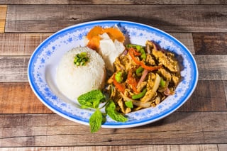 Fried tofu tossed in a hot pepper-lemongrass sauce. Served with your choice of steamed rice or a plate of vermicelli noodles | Đậu Hủ Xào Xả Ớt (Cơm hoặc Bún)