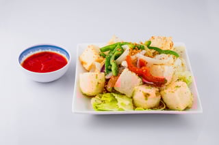 Calamari or shrimp (w/shell on), light battered & deep-fried, tossed with garlic, pepper & salt, red bell pepper & scallions | Tôm hoặc Mực Rang Muối