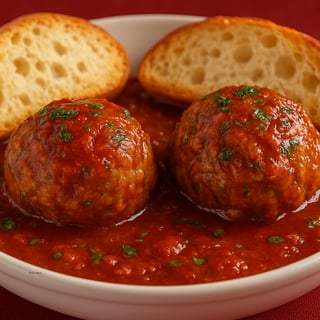 Two homemade meatballs soaked in Marinara sauce served with crusty Ciabatta bread.