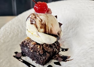 Pecan and Macadamia nuts wrapped in a moist, chocolatey brownie with a scoop of premium vanilla ice cream on the top.