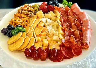 Our elegant charcuterie board will delight your epicurean senses with an artfully arranged platter of Red Brie, Blue Brie, Pepperjack, Colby, and Parmigiano Reggiano cheeses, premium meats such as Prosciutto, Salami Milano, and Salami Picante, and accented with Berries, Grapes, Walnuts, Green Olives, and an assortment of crackers. This indulgent feast is accompanied by a side of honey and is perfect for sharing.