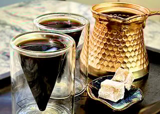 Traditional Turkish Coffee is unfiltered and is strong and aromatic with a unique texture from the finely ground coffee beans. Each order fills 2 cups and comes with 2 pieces of authentic, imported Turkish Delight!