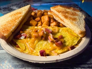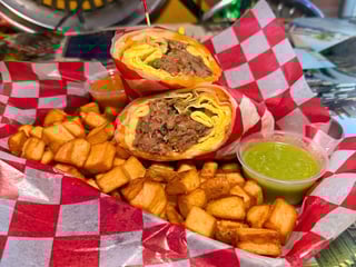 Green Chile Pulled Pork, Scrambled Eggs. Home Fries, and Cheddar Jack Cheese Wrapped in a Warm Tortilla.