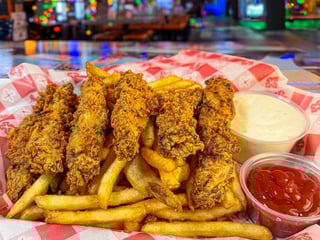 Hand Sliced Chicken Breast, Freshly Breaded and Deep Fried. Served with Fries or Tater Tots and Choice of Sauce.
