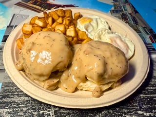 Fresh Baked and Buttery Flaky Biscuits Topped with Homemade Sausage Gravy.