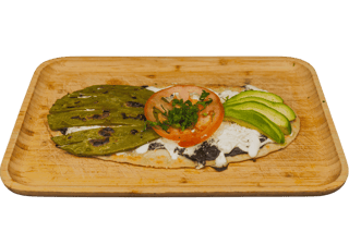 Servido con Frijoles, Quesillo, Crema agria, Queso cotija, Aguacate, Nopal y Cilantro. / Served with Beans, Quesillo, Sour Cream, Cotija Cheese, Avocado, Cactus & Cilantro.